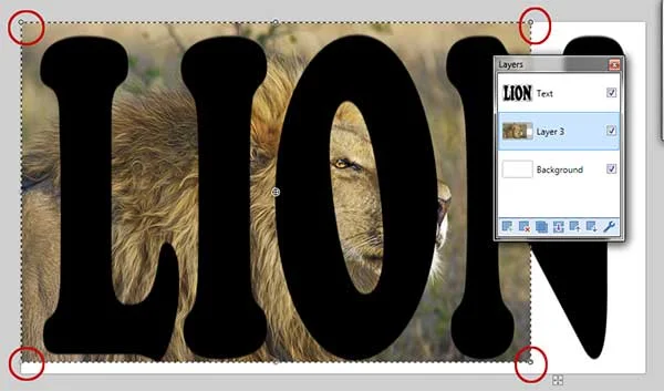 Choose Edit>Erase Selection or just press Delete. You will see the character is now filled with the image of Lion below it.